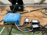 Firstly I have a couple of 12v solar panels (in series) that feed into a Victron solar charge controller, this device charges a 12v 80ha battery so that I have reliable power 24 hours a day, even in the depths of winter.
